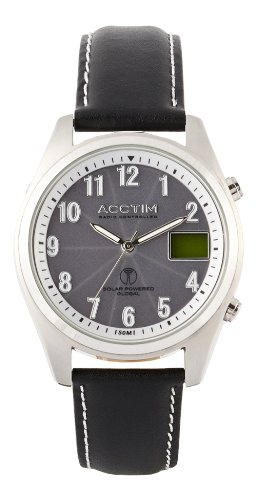 ACCTIM GLOBAL TIME. RADIO CONTROLLED WATCH. AUTOMATIC TIME SET UP. TIME CHANGES AUTOMATICALLY IN SPRING & AUTUMN. SIGNAL ACCURACY 1 SECOND IN 60 MILLION YEARS. SOLAR DUAL POWERED. WORLD TIME SETTING FOR INTERNATIONAL TRAVEL. BATTERY AND SIGNAL INDICATORS. ALLOY CHROME PLATED CASE WITH BLACK LEATHER STRAP. WATER RESISTANT TO 5ATMS.