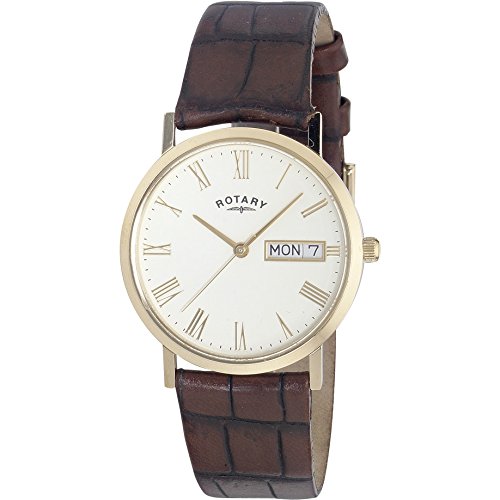 Rotary are a company rich in heritage and with a long history of producing exceptional and affordable timepieces. Rotary watches combine the ageless elegance of classic timekeeping with stunning contemporary designs. Product Description : - Quartz precision movement. - Cream dial. - Day Date feature. - Stainless steel gold plated case. - Dark Brown leather strap. Also Comes With : - Lifetime Rotary Guarantee (see Rotary website for terms and conditions) - Presentation Watch Box